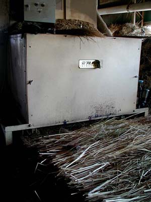 E 縦方向に化粧藁(けしょうわら)として、この 機械によって並べていきます この藁(わら)は「のろし」という特別に手を掛 けたものです |
